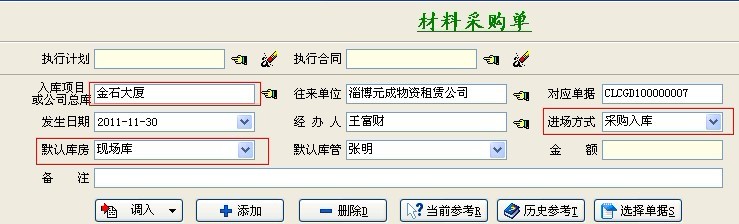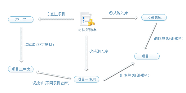 注:材料入場(chǎng)方式一般分為三種:1.材料入項(xiàng)目庫(kù)房、2.材料入公司總庫(kù)、3.材料直進(jìn)項(xiàng)目 如下圖: