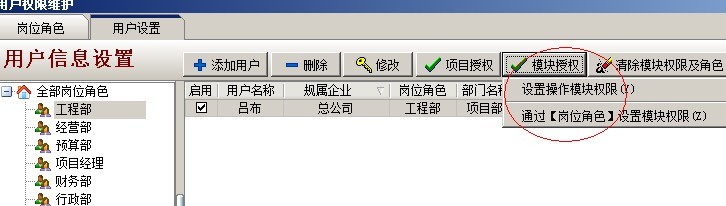 C:項目授權(quán)判斷,是指判斷該用戶是否有項目授權(quán),在系統(tǒng)維護(hù)模塊中【用戶管理權(quán)限設(shè)置】和項目維護(hù)中都可以進(jìn)行設(shè)置用戶項目授權(quán)。設(shè)置方法如下圖: