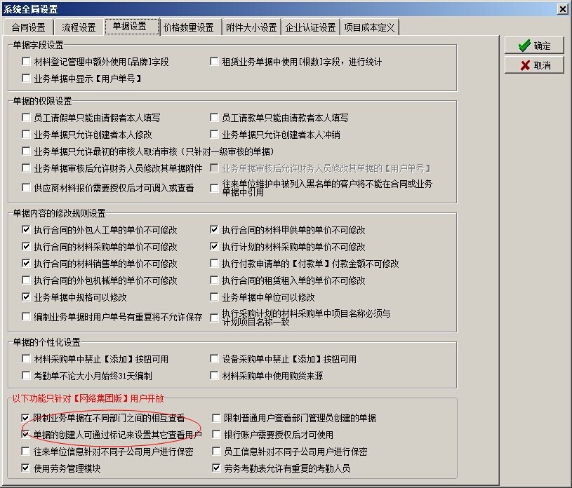在工程項目管理軟件(集團(tuán)版)中,存在一些設(shè)置(開關(guān)),使業(yè)務(wù)單據(jù)的訪問存在一定限制,只有在滿足條件的。用戶才能查看到該業(yè)務(wù)單據(jù)。如下圖: