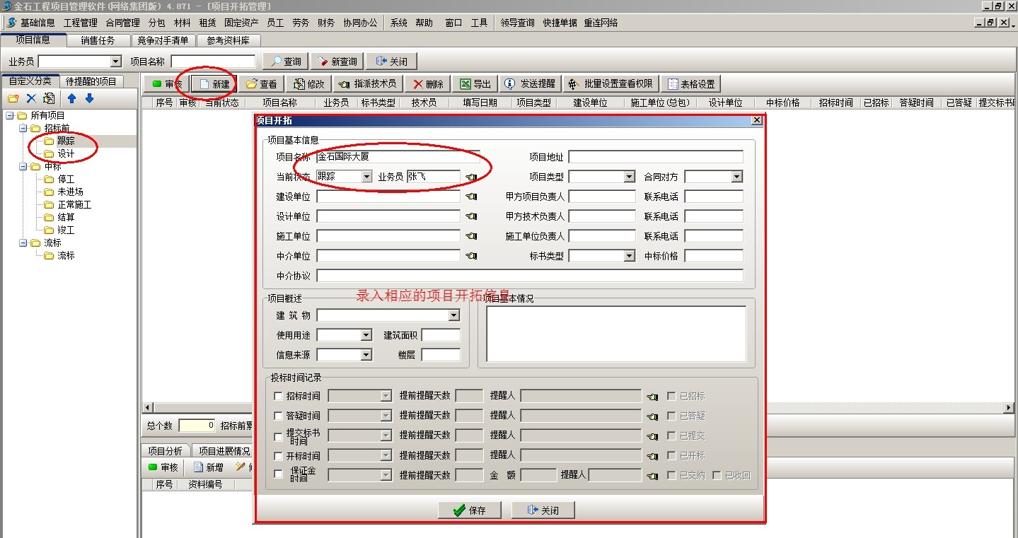 項(xiàng)目開拓建立之后,審核,然后可以錄入投標(biāo)項(xiàng)目的一些基本資料