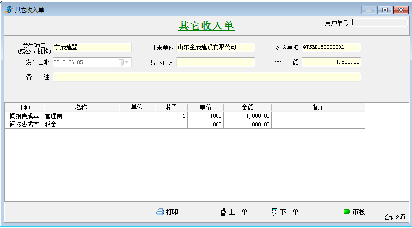 在工程項(xiàng)目資質(zhì)掛靠管理中甲方直接把承包款支付給借資質(zhì)公司(乙方B),我公司不會跟甲方產(chǎn)生往來賬款。由于是借的我方的資質(zhì),乙方B需要向我公司支付管理費(fèi)或者稅金。通過其它收入單來記錄這筆費(fèi)用。如下圖:
