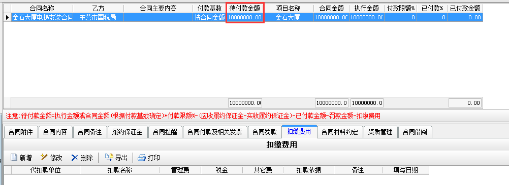 在工程項(xiàng)目資質(zhì)掛靠管理中乙方B借用乙方A的資質(zhì),乙方A需要扣除乙方B管理費(fèi),如果需要乙方A代開發(fā)票還需要扣除稅金。在分包合同中[扣繳費(fèi)用]模塊下操作,如下圖: