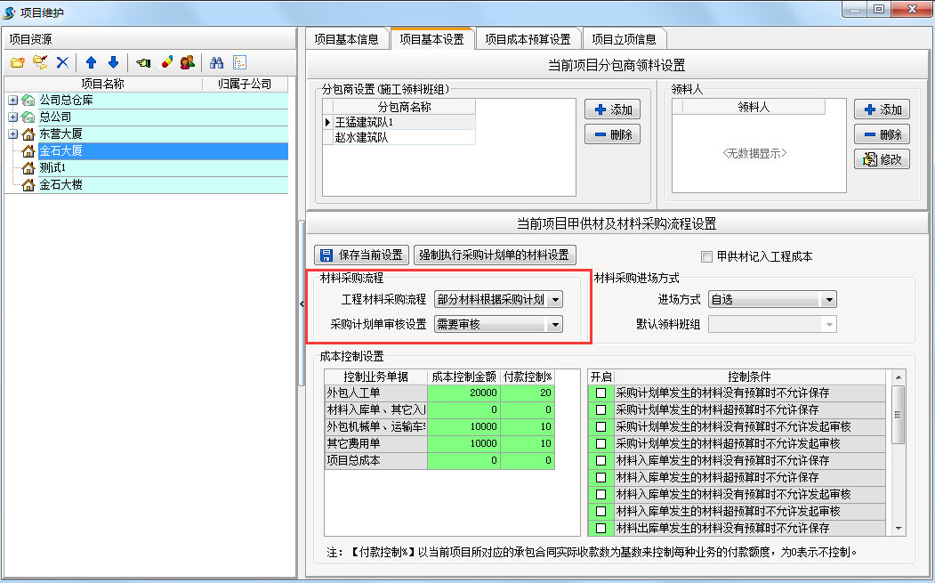 在【工程管理】模塊?【項目維護】項目基本設置可以設置采購計劃單,材料入庫單,材料出庫單,材料調撥單強制執(zhí)行材料預算單。如下圖