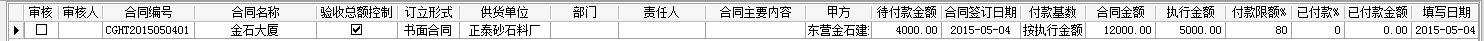 我們建立一個總價為12000的采購合同,付款基數按執(zhí)行金額,付款限額為80%。如下圖