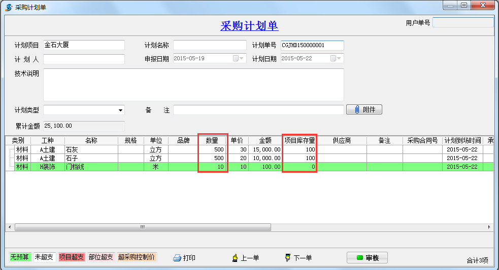 綁定好項目之后,在填寫材料相關單據時,會根據預算單的價格和數量進行不同顏色的顯示。這里我們以采購計劃單為例進行說明。