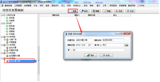 進入系統(tǒng)的“項目管理”模塊,點擊“項目任務(wù)圖編制”,點擊“新建”按鈕保存,(便于后期進行工程項目施工進度的管理)如圖: