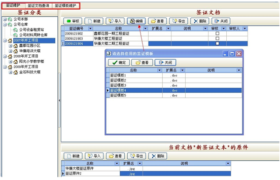 操作方法:在窗口左側(cè)選擇要做簽證的項目,在右側(cè)窗口點擊“新建”按鈕,輸入名稱后,點“編輯”按鈕,選擇一個簽證模板后,即可開始編輯簽證文檔。