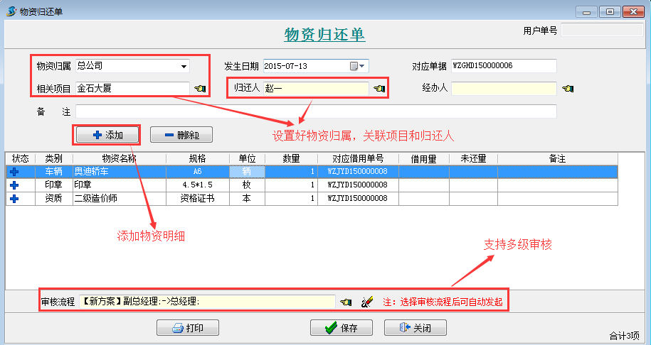 點(diǎn)擊主菜單中的【行政物資】->【物資歸還單】打開(kāi)物資歸還單列表 點(diǎn)【新建】按鈕,錄入如下: