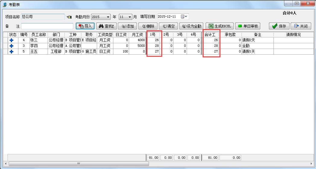 在工程管理軟件只記錄每人每月的合計(jì)工考勤,考勤單不區(qū)分項(xiàng)目,合計(jì)工填寫在考勤表的任意一天即可。
