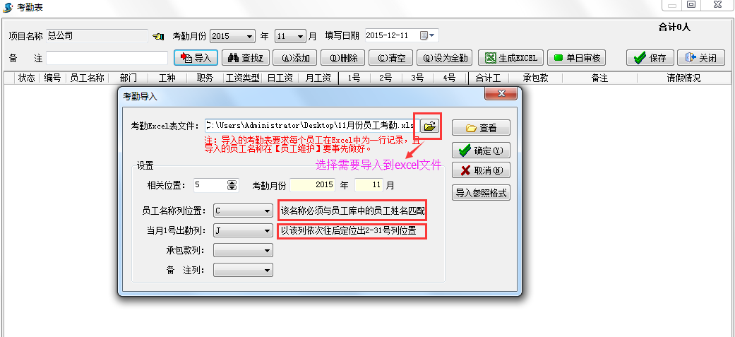 注:(1)如果合計(jì)工區(qū)分了項(xiàng)目名稱,如張三在A項(xiàng)目出勤10天,B項(xiàng)目出勤15天這種情況要建立兩個(gè)項(xiàng)目的考勤表對(duì)應(yīng)導(dǎo)入。