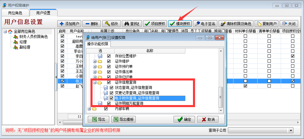 【系統(tǒng)維護】→【用戶權(quán)限設(shè)置】→【證件信息查詢】選擇下圖內(nèi)容打勾