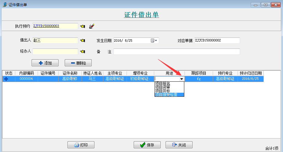 證件借出單可以選擇執(zhí)行我們上一步所演示的預約和需要跟蹤的項目
