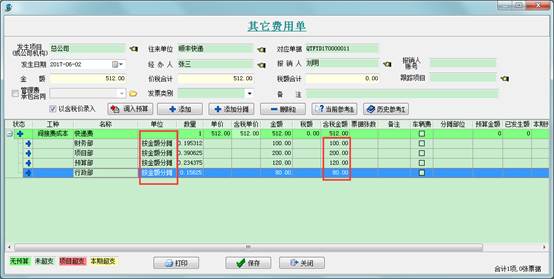 發(fā)生的項(xiàng)目我們選擇總公司,費(fèi)用名稱為快遞費(fèi)(可以事先在費(fèi)用科目維護(hù)里設(shè)置好)。