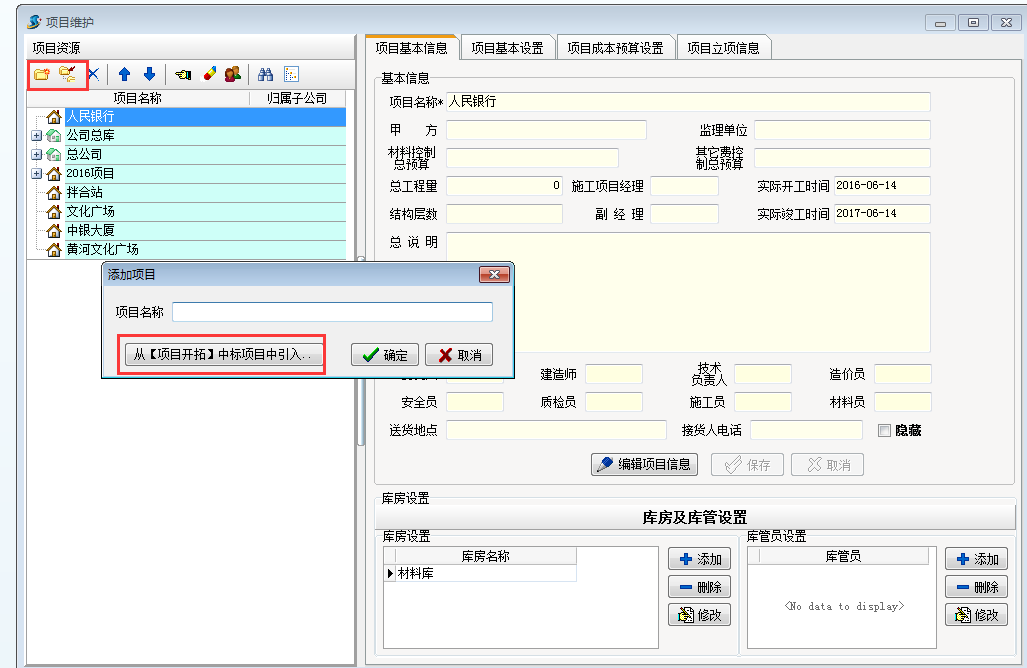 項(xiàng)目中標(biāo),在施工項(xiàng)目管理軟件項(xiàng)目維護(hù)建立項(xiàng)目,選擇從【項(xiàng)目開拓】中標(biāo)項(xiàng)目中引入。如下圖: