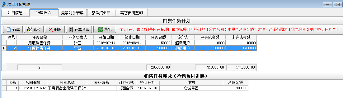 如上圖建立一個(gè)業(yè)務(wù)負(fù)責(zé)人為李四,任務(wù)總額為2000000的年度銷售任務(wù)。其中[已完成金額]是以開拓項(xiàng)目轉(zhuǎn)中標(biāo)項(xiàng)目后簽訂的【承包合同】中里的“合同金額”為準(zhǔn),時(shí)間范圍為【承包合同】的“簽訂日期”![未完成金額]是[任務(wù)金額]減去[已完成金額]得出的金額。具體操作如下: