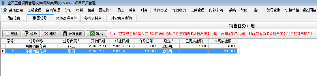 施工項(xiàng)目管理軟件【項(xiàng)目開拓】-【銷售任務(wù)】是用來(lái)管理企業(yè)給業(yè)務(wù)員設(shè)定銷售任務(wù)計(jì)劃的模塊。