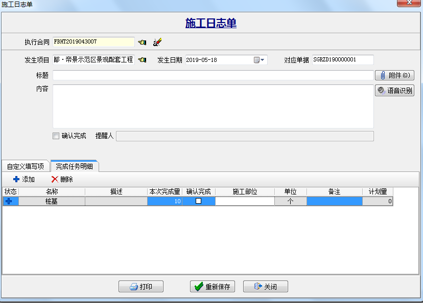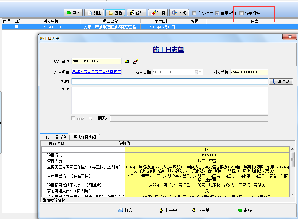 三、填報“施工日志單”根據(jù)自定義的字段 輸入相對應的內(nèi)容,點下圖中的“顯示附件”添加施工現(xiàn)場的圖片。
