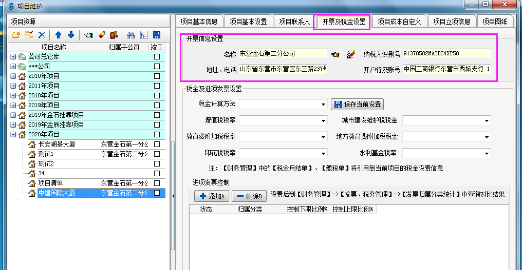3、項目維護設(shè)置歸屬子公司后會自動帶入開票信息。