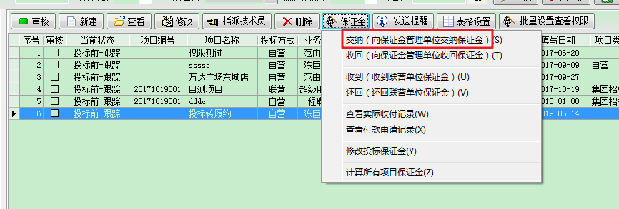 生產(chǎn)立項(xiàng)后,在項(xiàng)目開拓中,我們再次查看投標(biāo)保證金的相關(guān)信息,如下圖所示