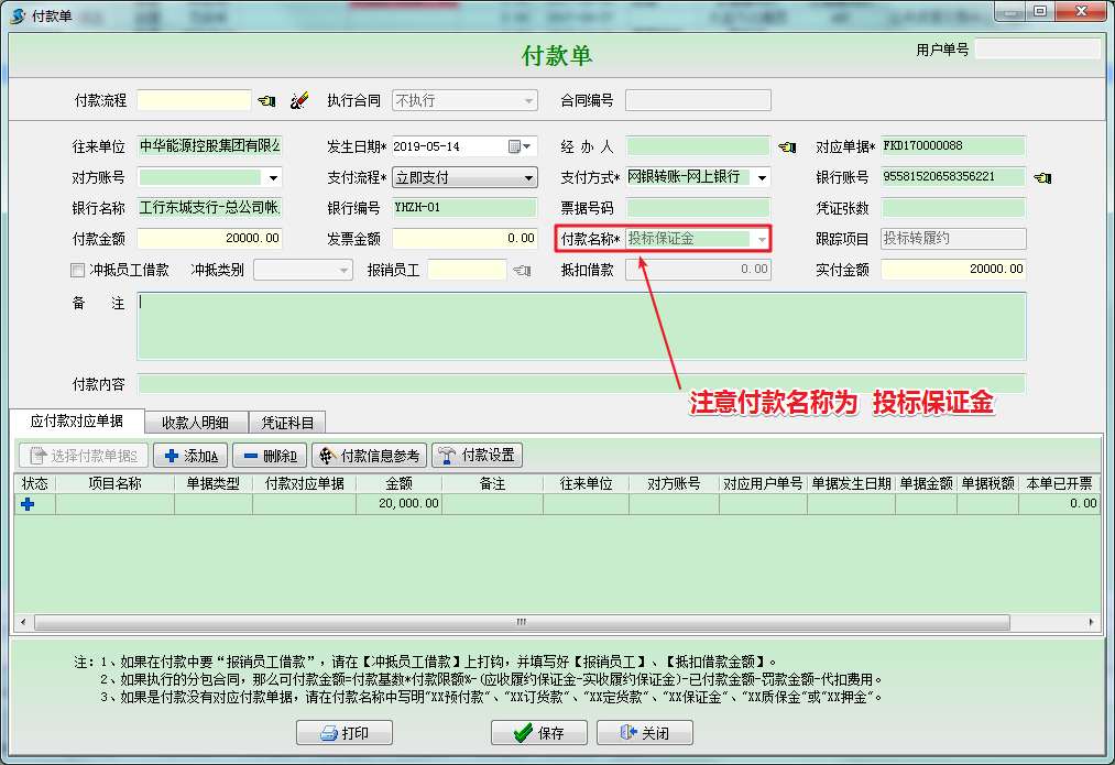 選擇結(jié)轉(zhuǎn)后,我們再去查看原投標(biāo)保證金的付款單時(shí),發(fā)現(xiàn)付款名稱變?yōu)椋和稑?biāo)保證金轉(zhuǎn)履約保證金,如下圖所示,