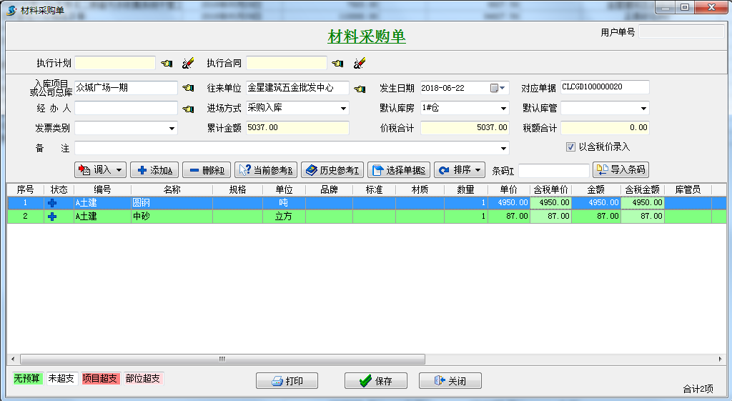 材料調入到材料采購單中之后,執(zhí)行材料采購。具體執(zhí)行流程參照第一種情況,如圖: