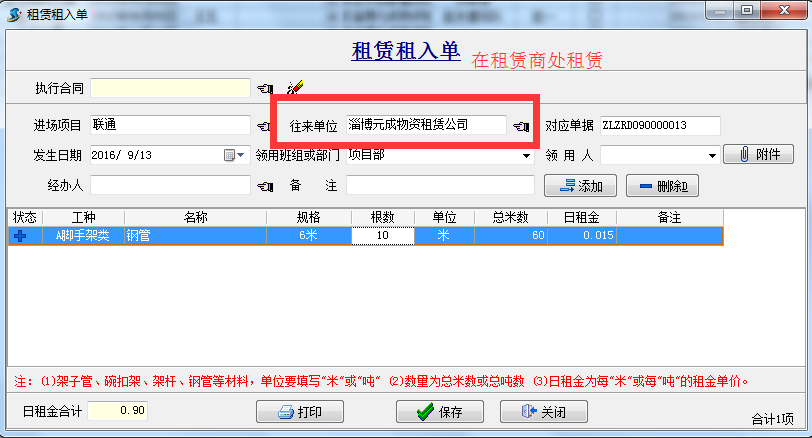 2.租入對方單位“淄博元成物資租賃公司”10根6米的鋼管