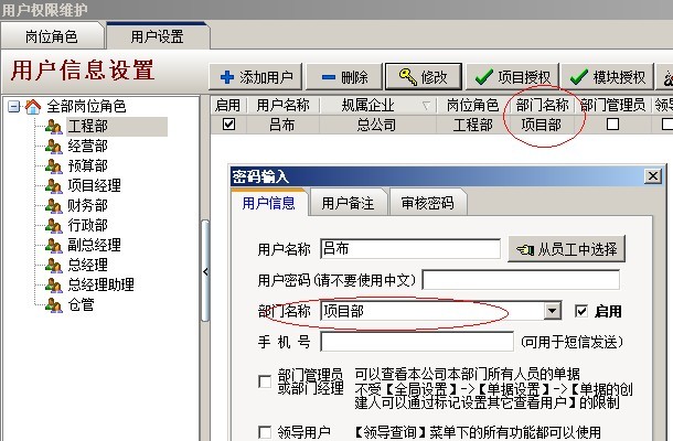 如果,【限制業(yè)務(wù)單據(jù)在不同部門的相互查看】這個開關(guān)開啟,那么與單據(jù)創(chuàng)人部門不同的用戶(多級審核單據(jù)中審核人不受限),就是無法看到該業(yè)務(wù)單據(jù)。判斷是否與單據(jù)創(chuàng)建人部門相同,是看用戶列表中的部門項。如下圖: